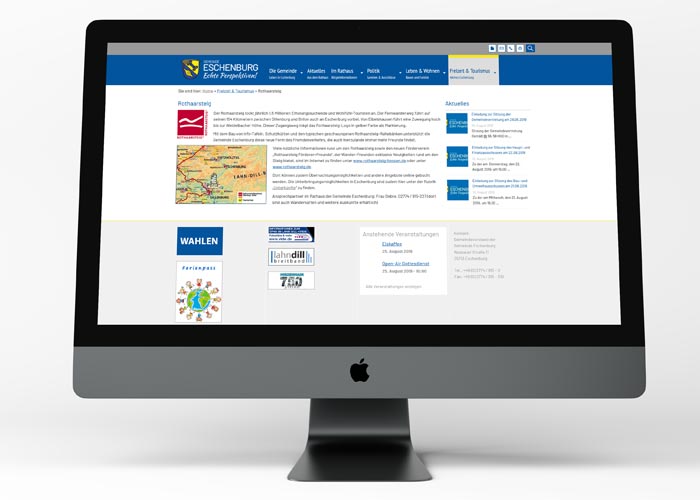 klank media entwickelt maßgeschneiderte Internetseiten für Kommunen, mit modernem Webdesign und App- Entwicklung. Die App der Gemeinde Eschenburg fungiert als digitales Bürgerbüro und punktet durch vielseitige Anbindungen, z. B. an Gemeindewerke und Schwimmbad. Ein Imagefilm und Fotoshooting über das Freizeitbad-Panoramablick wurde ebenso durch uns realisiert.
